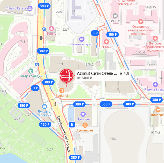 Из области: съезд с Третьего транспортного кольца на Олимпийский проспект в сторону центра, далее около 2 км прямо. AZIMUT Сити Отель Олимпик Москва будет слева.